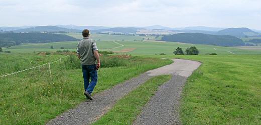 Aber kein Problem: Folgen Sie dem anfangs geschotterten, dann geteerten Weg hinunter ins Tal. Sie überqueren später die Strasse von Duppach nach Steffeln und gehen immer weiter langsam bergab bis zum